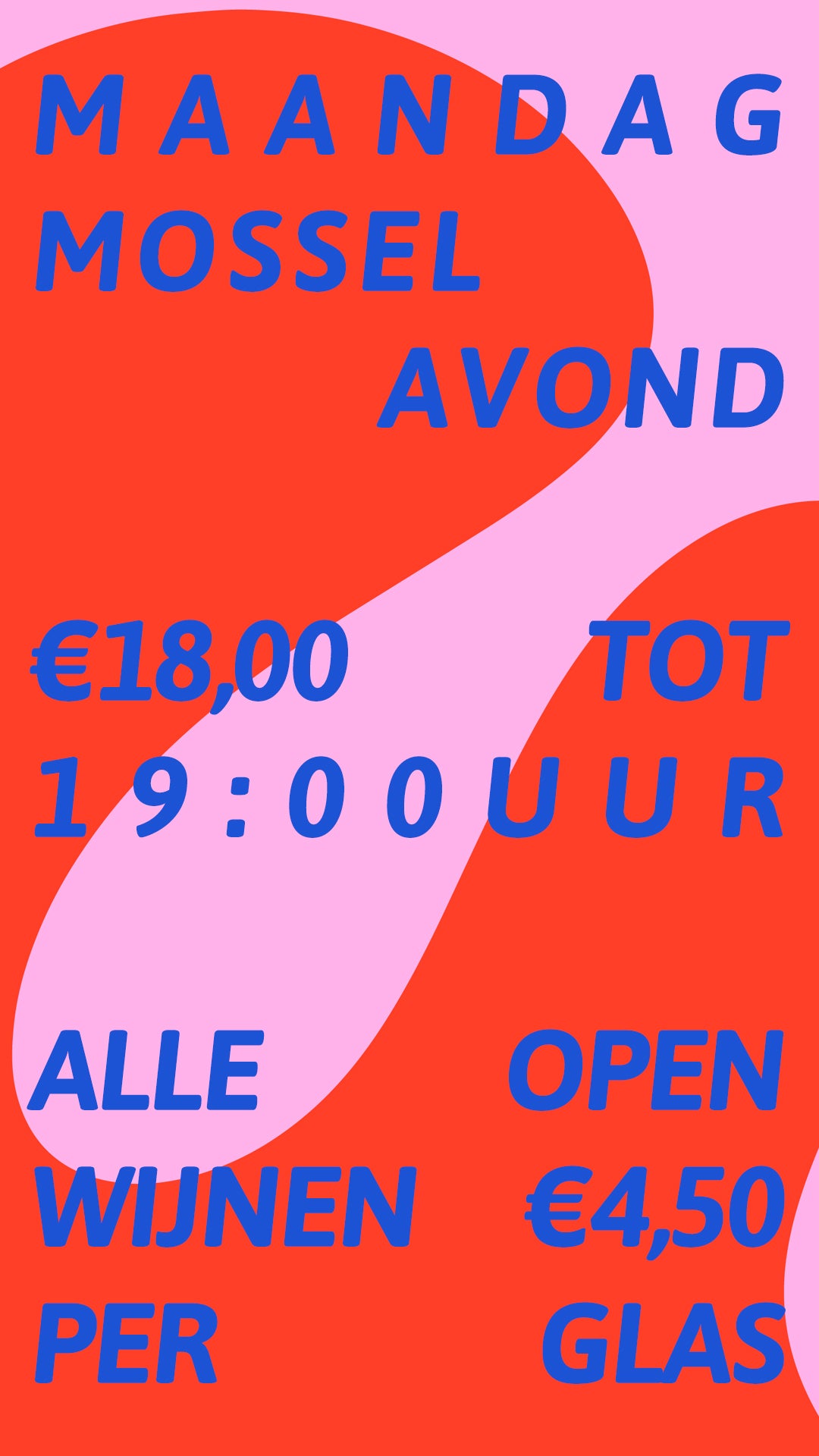 Begin je week goed met eenpannetje dampende mosselen voor maar €18,-. Perfect in combinatie met een glas van onze open wijnen, die je deze avond voor€4,50 per glas bestelt. Een relaxed begin van de week met de smaak van de zee binnen handbereik.