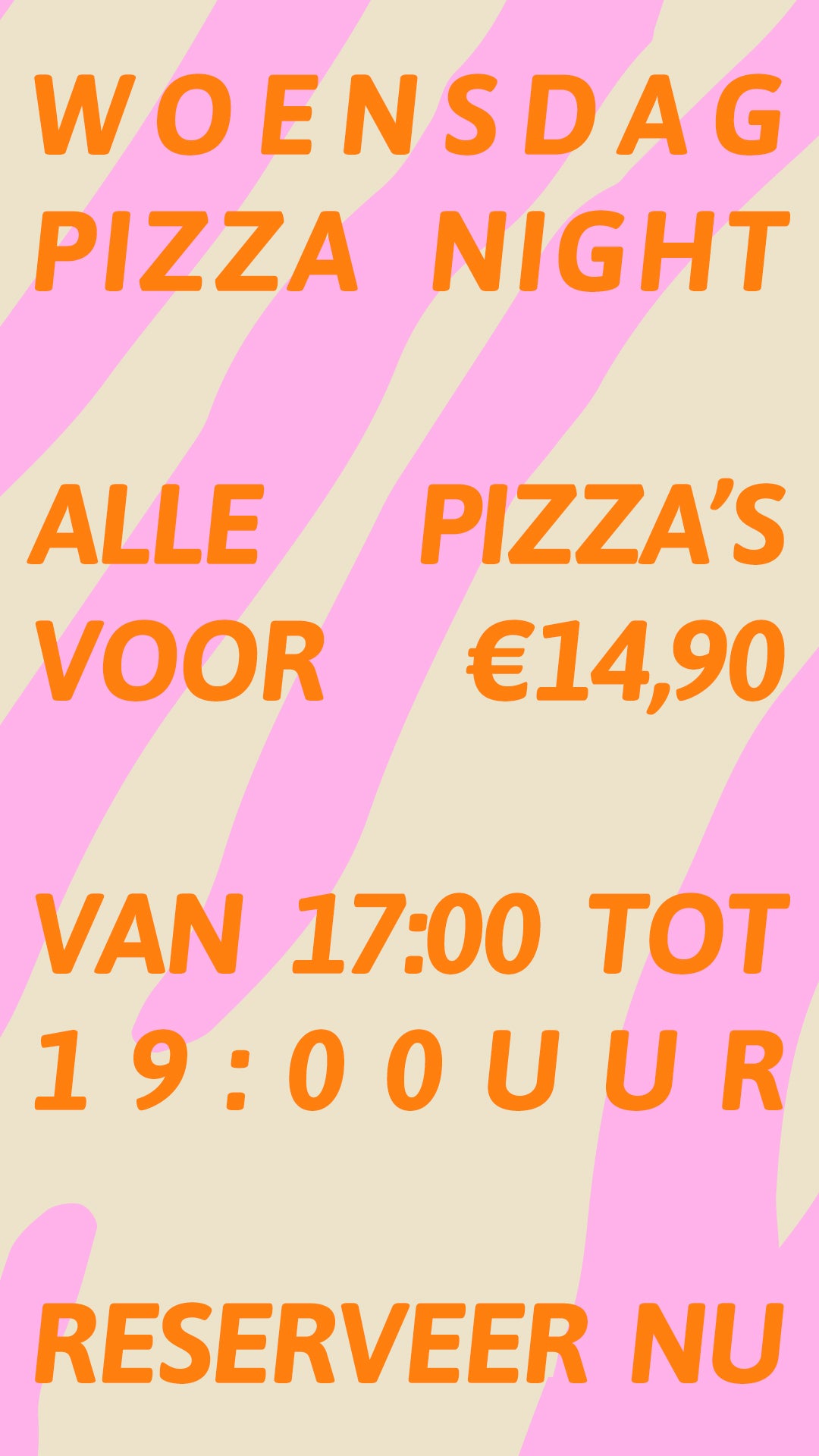 Woensdagavond staat helemaal in het teken van pizza! Elke pizza uit onze houtoven kost deze avond slechts €14,90. Dunne, knapperige bodems en rijke toppings maken dit de ultieme avond voor pizzaliefhebbers.